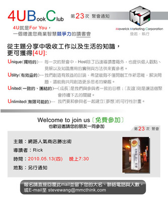 5月13日 19:30【4UBC】將由Rick為大家整理並分享[網路人氣商店如何勝出的關鍵]預估2010年網路...
