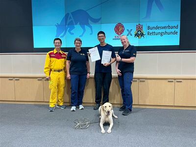 內政部消防署特種搜救隊日前舉辦德國聯邦救難犬協會共同訓練課程及認證測驗,桃園市消防局搜救犬小組傳來捷報,領犬員盧弘恩與搜救犬APRIL順利通過「路徑追蹤高級認證」,成為全台第一隻取得該項國際專業認證的搜救犬,為我國搜救能量再添新戰力。