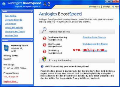 AusLogics BoostSpeed是一套能讓你的PC運行速度更快的理想解決方案,無需作任何硬件改動,這個軟件就能幫助你優化視窗系統的運行,以及優化互聯網絡的連接和速度。新版本支持對IE7的優化等等。