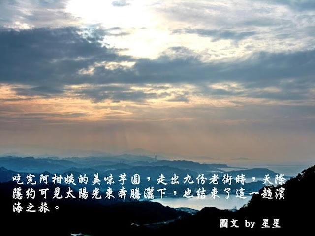 「來!來!這個海景超美的,大家一起來拍照吧!」我放大聲音吆喝著。擔任攝影師這也是我每次出遊的任務,因為在我的浪漫畫面下,加上些微的修圖效果,照片中的歐巴桑總是漂亮許多耶!而聽著她們驚喜連連的驚嘆聲,我的心裡也有著暖暖的開心,能夠帶給別人歡笑也是一種幸福,不是嗎?「好囉!要拍囉!挺胸縮小腹!」在我的指令下,歐巴桑們擺出了最美的pose,當然也因為我的口令紛紛咧開嘴開懷大笑!