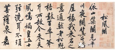 尤其寒食帖、花氣熏人帖、蜀素帖,松風閣帖等 ,使得宋朝書法相當引世人注目 ,就連日本、韓國也都讚譽極佳 。 蘇東坡因烏台詩案被謫,在黃州寫下那 家喻戶曉的寒食帖 ,不知感動了多少人 , "春江欲入戶,雨勢來不已。小屋如漁舟,濛濛水雲裡。 " 膾炙人口 ,以及 黃庭堅書法 松風閣帖 寫來真是氣勢非凡、氣度極佳 ,吸引眾人眼球。