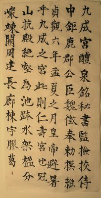 九成宮醴泉銘,唐太宗避暑乎九成之宮 , 因有感於離宮用水的困難,山中偶發現一甘泉湧出,魏徵作此文以紀上天感應、祥瑞之象難得,由歐陽詢抄錄作碑,流傳下來,碑立於陜西。