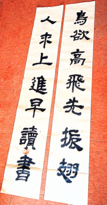 大家好 ,這次所寫的是個勵志的聯 : 鳥欲高飛先振翅 , 人求上進早讀書 ~