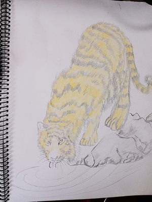 將原本素描的畫作加上顏色 , 隨類賦彩 ,讓老虎就擁有黃色的皮毛 ,整個作品真是好看多了~