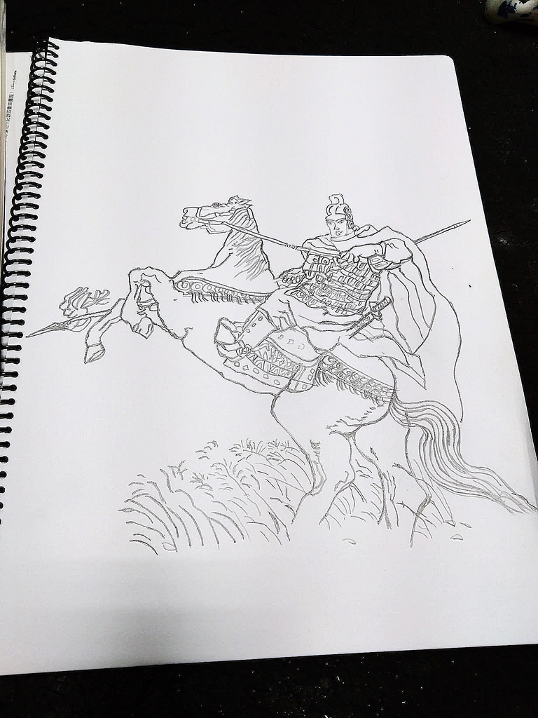 一位雄姿英發的霍去病將軍 , 便試著將之臨摹下來 , 霍去病將軍是漢朝名將,驍勇善
