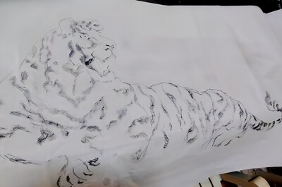 所以我也一直很想臨摹他的老虎 ,今天放假較有時間 ,登山完畢返家後,便先炭筆打