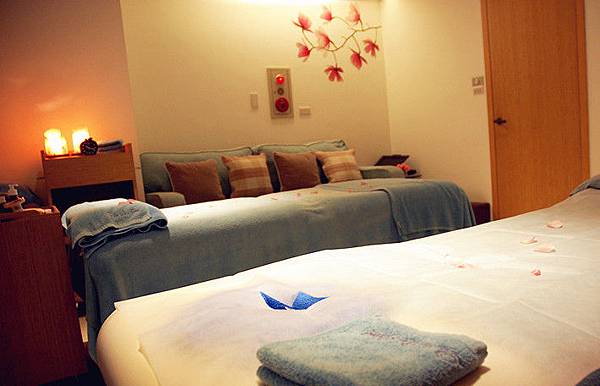 這次芳療帶恣語到三樓的雙人房空間,柔和的燈光與溫馨的空間,空氣中瀰漫著淡淡的香味,床上的玫瑰花瓣更添浪漫風情,而其中的一張床已舖好,就等著恣語就位囉。
