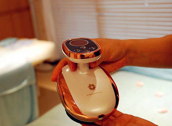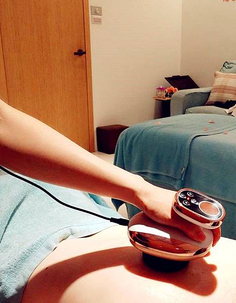 師先在身上塗上精油簡單的按摩,接著就開始使用儀器進行全身的療程,儀器在身上感覺一股吸力,芳療師會依照您的身體現況調整力道,這儀器的原理類似中醫的刮痧拔罐,在比較有氣結的地方或覺得較有感覺