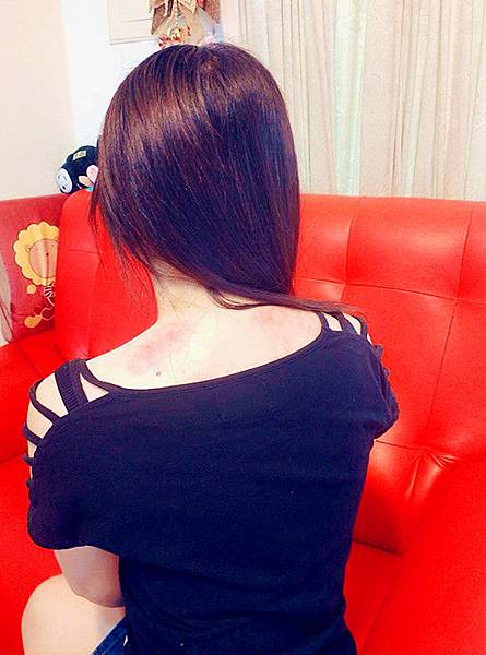 這是回家後拍的,從肩而下兩邊其實有著明顯的出痧,不過但因光線有點亮看起來不太明顯。