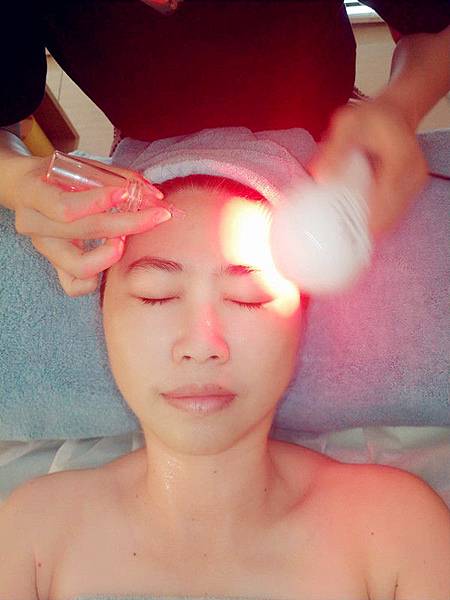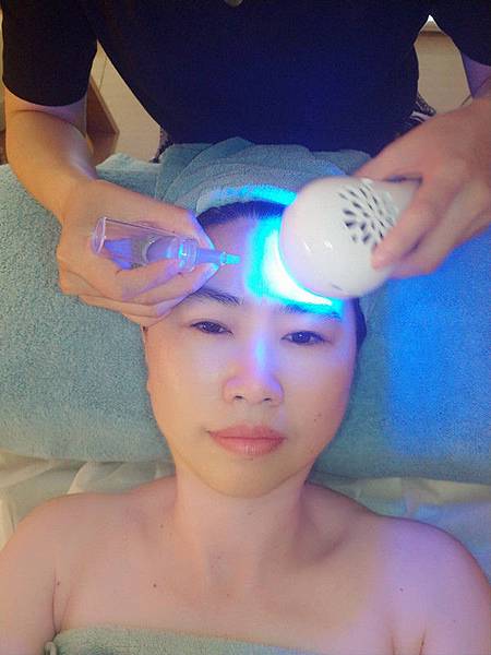 接著芳療師會以這台緊緻拉提導入儀來操作,開始是藍光的冰導模式,一面徐徐倒入精華液,一面在臉上滑移,整個臉冰冰涼涼的感覺。