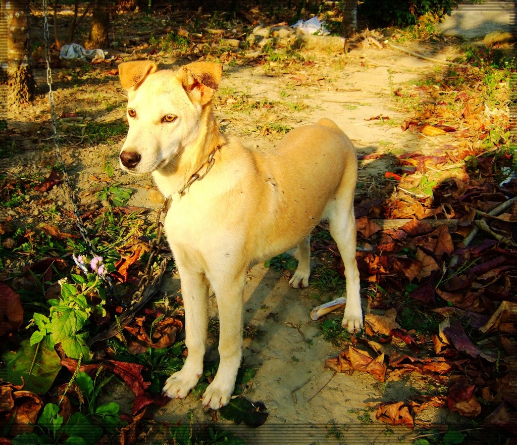 (圖片說明: 小黃狗在冷風中獨自顫抖 見客人來 愛嬌的打招呼)