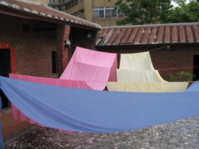 天氣晴朗的午後,媽媽們帶著小幫手進行染布作業,當庭院曬上紅藍黃的染布時,三合院頓時古意盎然 ,期待大家用心完成的染布佈置出一間充滿歡樂的陽光故事屋!