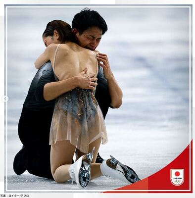從短曲(short program)落後6.9分,到長曲(free skate)以新世界紀錄158.13分後上奪冠,贏得日本歷來首面冬奧雙人賽金牌。他們選用電影《神鬼戰士》《安德烈波伽利演唱的主題曲-在你手心》為襯底音樂。兩人走過失敗、傷痛與孤單。這面金牌,是17年不退場的證明。更教會我們:只要不放棄,命運終會回頭擁抱你。