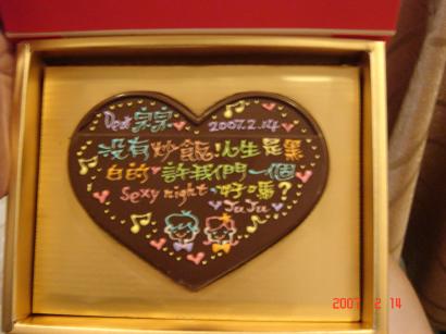 這是2007年ㄉ2/14我買給羅羅ㄉ巧克力喔~~超可愛ㄉ因為上面可以寫你想說ㄉ話喔~~我是在西門町做ㄉ~~我自己有超喜歡ㄉ啦~~希望羅羅也喜歡喔~~我真ㄉ很擔心又把一些吃ㄉ放到爛~~呵呵因為羅羅常常把一些包裝可愛ㄉ零食放到過期還捨不得丟ㄋ~~哈哈哈