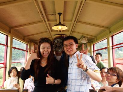 作火車當中快要下車ㄉ時候~~突然有一ㄍ怪獸出來ㄟ~~~他是出來跟大家合照不知他是象徵好還是不好~~~蛋ㄊ還會說簡單ㄉ中文喔~~漫庫ㄉ~~當然我跟羅羅一定要跟他合照ㄉ喔~~呵呵