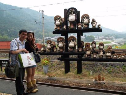 ㄟ這ㄍ是下ㄌ小火車ㄉ時候裝飾在鐵道上ㄉ~~這ㄍ應該是吉祥ㄉ象徵吧~~我頭一次看到用貍貓組成ㄉ牆~~所以當然要拍照留念ㄉ啦~~呵呵