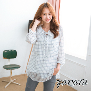 momo購物網-【ZARATA】雙口袋前綁帶格紋娃娃裝上衣(白格)