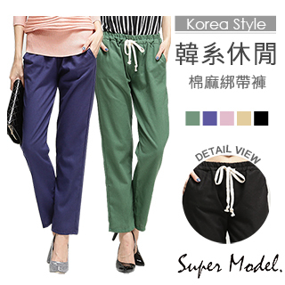 momo購物台,momo購物網:【名模衣櫃】韓款時尚棉麻綁帶休閒褲(共5色-M-XXL供選擇)