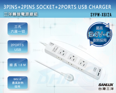 知名品牌三洋 SYPW-X612A 單切3孔3座+2孔3座+2PORT USB插座(含開關)安全延長線,