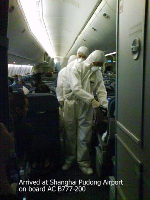 機上廣播"各位旅客請注意,為了控制和預防甲型流感,在飛機抵達閘口後,中國將會有衛生單局的檢驗人員上機來測量各位...
