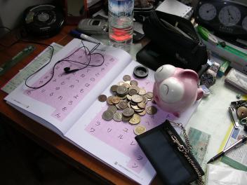 背了一會兒,然後就剛好看到皮包裡面一堆零錢,就把它全部拿了出來,不知道有沒有人跟我有一樣的偏好,付錢喜歡付鈔票,不習慣付零錢,可是身上又ㄧ定要帶著零錢,不然會覺得怪怪的,不過拜此偏好所賜,我的大眼金魚存錢筒越來越重= =,索性就將它全部倒出來,數數看到底有多少錢-經過結算,總計是401元,難怪我說為什麼皮包中的ㄧ百元鈔票會一張一張消失,原來如此…
