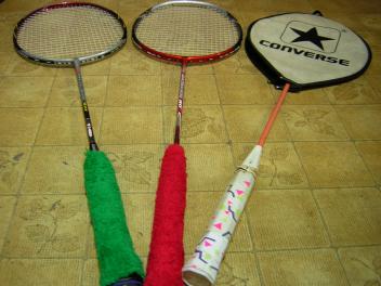 照片是自己目前擁有的三隻拍子與拍套,紅色手把是我自己纏的,本來想買一捲黑色的手把布,可是芳盈也要用的緣故,所以就被他強迫買紅色的,雖然也不錯看,但是我還是要裝出一副委屈的樣子,這樣以後她叫我幫忙纏時,就可以跟他收個手工費了,當然會比外面便宜嚕…