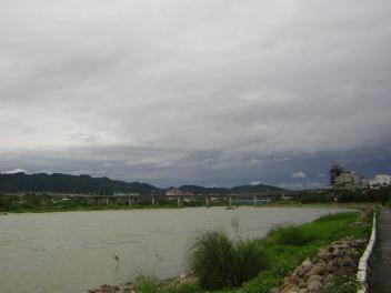 踏過了天橋到馬路的另一邊,彷彿置喧囂的世界於腦後,站在網球場旁看著居民們打球,試著把自己融入那情境中,記得小時候家門口對面也有個網球場,漏球時的大呼小叫是我童年的回憶,昨天在院羽練習打起雙打時,我想全場就屬我漏球的聲音最大聲吧…(原來在我身上也帶了某些故鄉的回憶),沿著新店溪的河岸邊走著,偶而坐在堤防上,望著河中央湍急的流水發呆,「河水,河水,向東流…」,我想那首兒歌是那麼唱的吧,記得國小時我也曾自願升旗時上台唱兒歌,那時的我似乎無憂無慮…