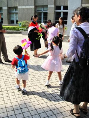 除了拍人物之外,我喜歡拍些其他人不會想拍的東西,一個博班學長帶著他的小孩一起來參加撥穗,剛學會走路的小男孩就這麼拿著一朵折直後比他還高的布置花在那跑來跑去,於是即便再熱,這一幕還是讓我在鏡頭後微笑了很久。