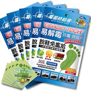大家都知道,台灣是一個潮濕的國家 往往很多包包、鞋子,長時間悶著沒穿就容易發霉有異味 放了除濕包效果依舊普普 Echain Tech易解霉 除臭防霉片一包30入 據說是全球鞋業皆都採用的防霉商品, 能有效抑制霉菌滋生,分解霉菌,消除因蛋白質分解所產生的異味, 如:腳臭、廚餘腥臭味、廁所臭味....等,也都有不錯的改善!