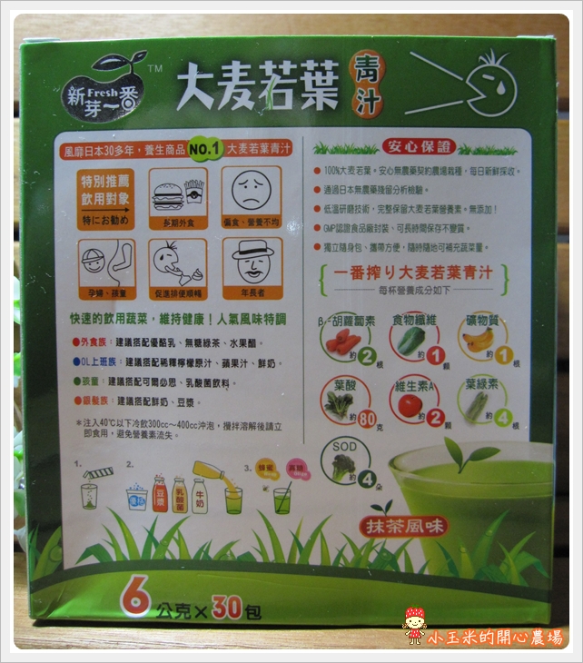 一盒「一番搾大麥若葉青汁」裡有30入,每個小包裝是6公克,