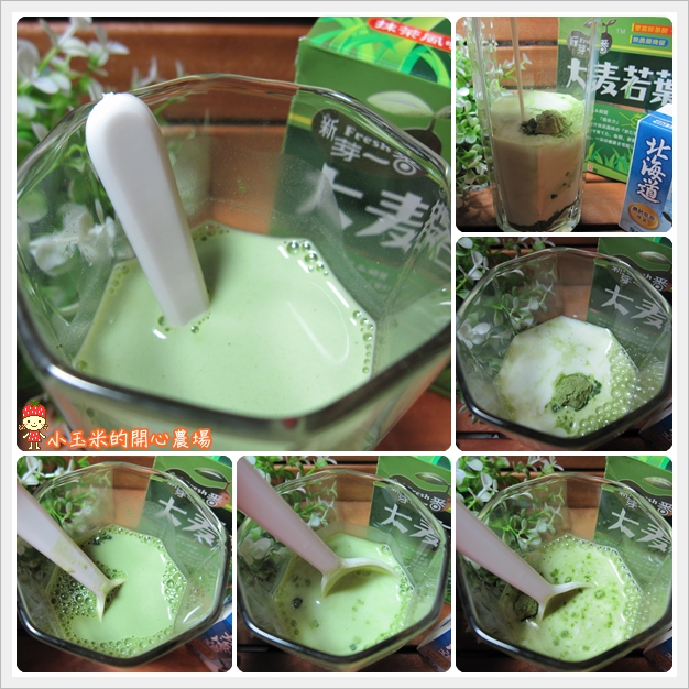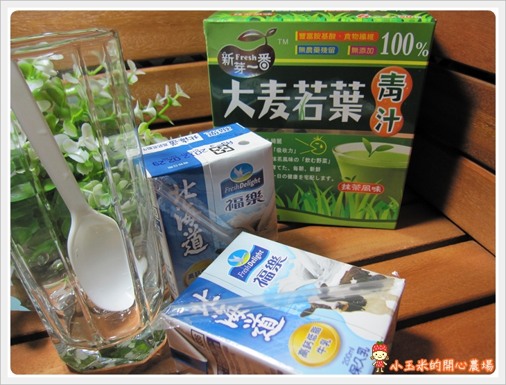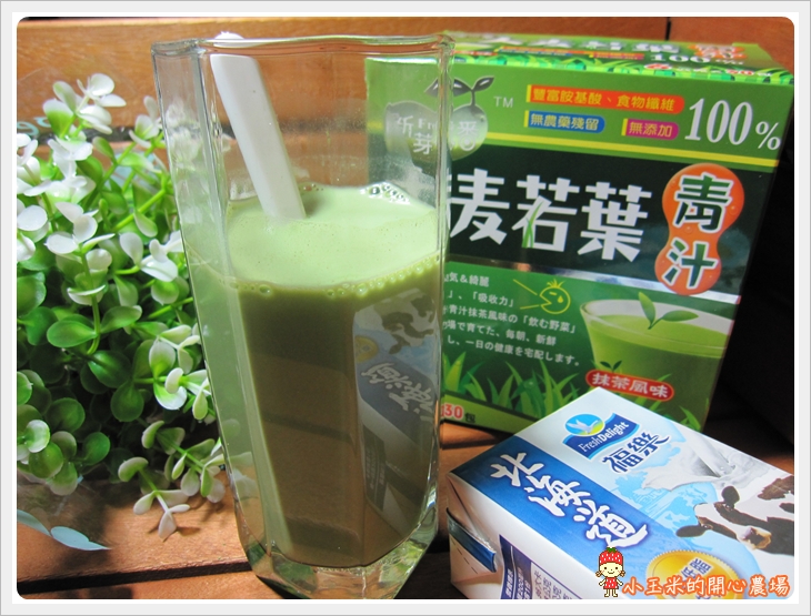 玉米媽準備了鮮奶保久乳(或是鮮奶的話更好),再加上一包「一番搾大麥若葉青汁」,