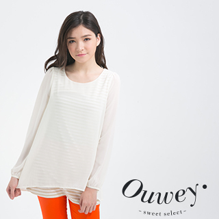【OUWEY歐薇】假兩件拼接雪紡細條上衣(米)那裡買
