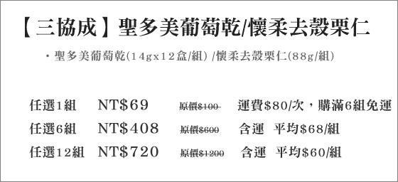商品訊息簡述: 平均每組最低只要60元起即可購得聖多美葡萄乾(14gx12盒/組) /懷柔去殼栗仁(88g/組)任選:1組/6組/12組,購滿6組免運。