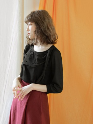 【2019流行產品】珍珠綴邊造型拼接透膚袖上衣 暢銷