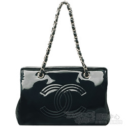 CHANEL 經典雙C LOGO漆皮銀鍊三層肩背包(深藍) |