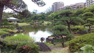 用完餐,還有一點時間,大家就在導遊的集合下,以步行的方式去附近的日式庭園----見濱園。大人門票100日圓,很便宜,裡面還有茶室,但我們太早去還沒開始營業,就單純看看風景。結果大家最熱衷的竟是餵魚和鴨子(小孩瘋狂了),連鴿子也飛來湊一腳(原來那個飼料是水裡游的、天上飛的都通用呀)。而且有隻鴨子嫌我們丟得太慢,直接爬上岸來討,一群小孩又哇哇叫了,幸好用飼料引誘法把牠引回去池裡。另一隻特別白的鴨子則是一直在遠方不和大家又擠又搶,感覺好像外野手在等著接別人漏接的球XD