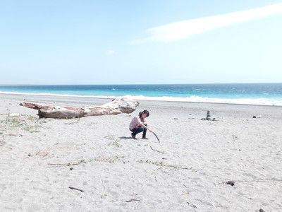 沿著車站前步道走下去,過馬路後彎進小路,就會到千禧曙光紀念園區。海風真的超大的,比昨天在池上還大,池上至少有山有田,而海邊就是光禿禿一片,沒有什麼遮蔽物,但海色很美,有三層顏色,看到浪花襲捲而來,真想跳下去滾一滾~