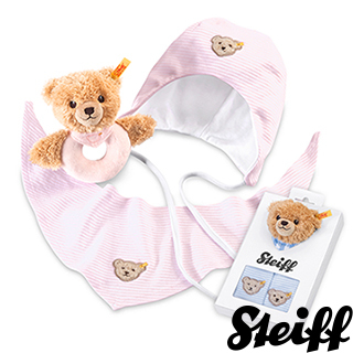 【STEIFF德國金耳釦泰迪熊】手搖鈴 帽子 圍兜兜(熊頭禮盒)
