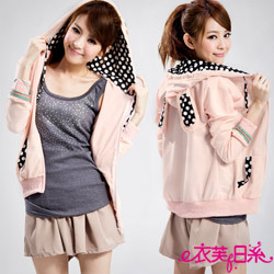 超卡哇伊的兔耳朵造型連帽設計,搭配上別出心裁的蕾絲滾邊及點點配色,輕鬆打造甜美女孩的活潑氣質,俏皮滿點喔!