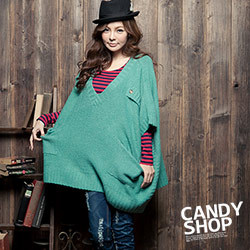 【candy小舖】復古簡約主打肩釦V領寬版韓羊毛衣-時尚藍綠
