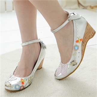 【Ameber】夢幻蝴蝶花日系小羊皮手工鞋軟木楔型跟鞋-B321(銀色)