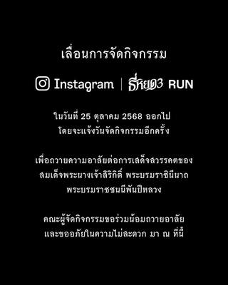 因為泰王太后辭世,泰國全國進入哀悼期,雖官方尚未明訂公告禁娛,但要民眾「酌情遵行」。而《鬼聲泣3》路跑活動主辦單位今日上午則在臉書、IG等社群平台發文宣布「活動延期」,並表示:「我們謹向詩麗吉王太后殿下致上最誠摯的哀悼,同時對因此造成的不便深表歉意。」