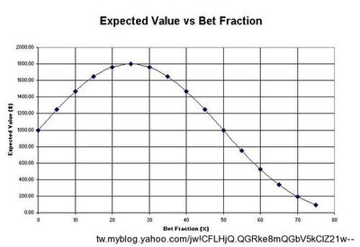 This graph shows the expected value of a 50% lucky (balanced) coin for various levels of bet fraction and payoff. The expected value has an optimal bet fraction point for each level of payoff. In this case, the optimal bet fraction for a 1.5:1 payoff is about 15%; at a 2:1 payoff the optimal bet fraction is about 25%; at a 5:1 payoff, the optimal bet fraction is about 45%. Note: Figure 4 above is the cross section of figure 8, at the 2:1 payoff level. |