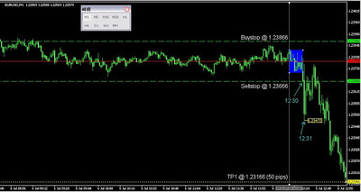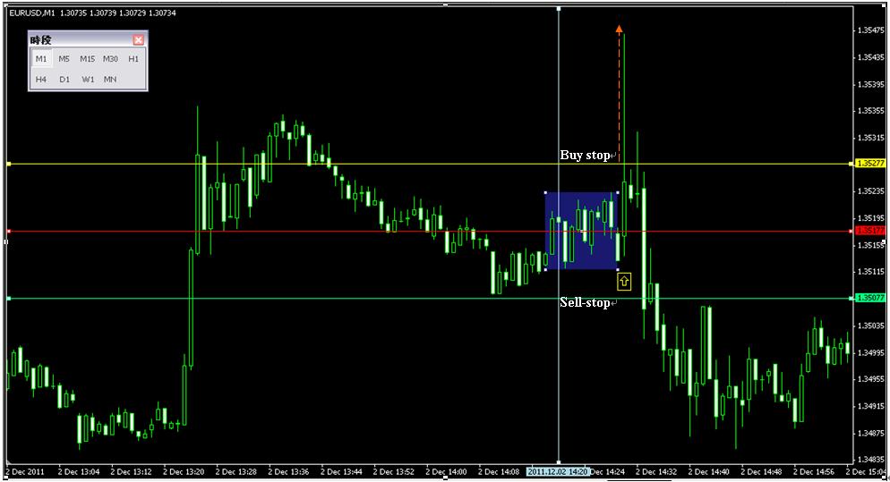 2. 因此,可以找出藍色框上下界的中線(上圖紅線),上下各加10~15 pips後當作是Buystop 與 Sellstop的進場價位(上圖黃綠二線) (PS:手快的人可以在公佈前1~2分鐘的市價當中線參考值上下各加10~15pips後預掛stop交易單...呵呵...小心別key錯各單進場價位喔!!!!);