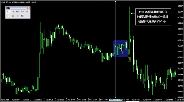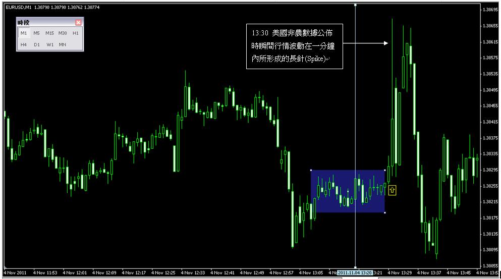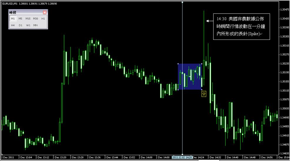 尖波或長針策略(Spike B.O.)Spike(長針或尖波)行情常常出現在許多重要新聞發布的瞬間,原因乃是出乎意外或期待的重要事件可能對經濟市場的影響,因而造成外匯市場的波動。其中,各國經濟數據的公佈,大概是外匯市場中各投資者固定所期待的新聞資訊。---先以美國非農數據為示範例子: