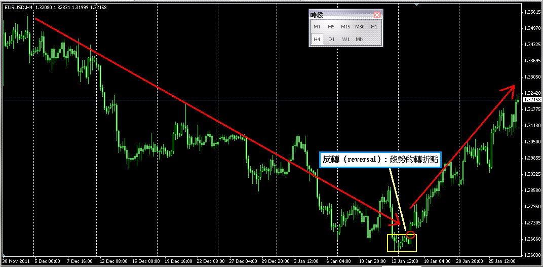 當我們把上圖盤勢從30分鐘時框帶回到4Hr時框時(如下圖),我們可以看到歐美貨幣對(EUR/USD)由下跌趨勢轉為上昇趨勢的轉折點