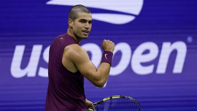 艾卡拉茲(Carlos Alcaraz)28日直落3晉級美網第3輪。門框矽利康(圖/美聯社/達志影像)西班牙網球好手艾卡拉茲(Carlos Alcaraz)一甩去年在美國公開賽早早出局的「負面思緒」,...