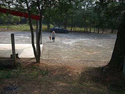 不過到達時已十一點了,祠堂前的廣場已停了別輛車,原來三老院的兩個女兒兩家人回來過節,幾個年輕男孩就在三老院門前的廣場丟棒球,我們穿越到寄放農具的工具間拿東西,再戴著斗笠拉著行李車出來,整個畫面感覺起來挺可笑的。
