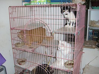 小店的樓上有四隻貓,都是貓媽從小養大的,最後寄放在這裡。我變成這四隻貓的乾媽,每天餵食和清便盆,我總是說:「這裡是貓咪的養老院。」牠們所受的待遇和最差的養老院差不多,固定的空間,簡單的飲食,如果我沒到店裡來,牠們就自動節食一天。一年四季都無法出貓籠活動,因為籠外的空間雜物太多,更怕不小心跑到樓下,隨著客人就出去逛街了。
