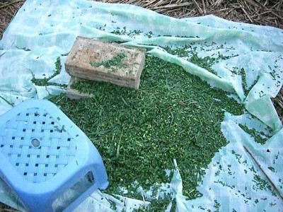 乾草的上面則鋪一層剛剁好的新鮮雜草。乾、濕草交互堆疊,這其實是從書上讀來的作法,美國與澳州有機農法專家的堆肥法:乾、濕雜草,骨粉、海藻、岩石粉,他們認為濕草就含有氮素,乾草則主要是碳素,用這些材料就可以做成很棒的堆肥。而我更精簡的想做「自然農法」的堆肥,所以只要乾、溼草就行了。